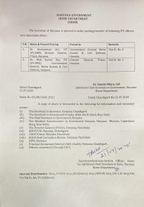 Haryana IPS Transfer : बीते कुछ दिनों से हरियाणा में चल रहा अधिकारियों की ट्रांसफर का सिलसिला सोमवार को भी जारी रहा। गृह विभाग की अतिरिक्त मुख्य सचिव सुमित्रा मिश्रा की ओर से जारी आदेश के अनुसार प्रदेश के दो सीनियर आईपीएस अधिकारियों का एक दूसरे के स्थान पर तबदील किया गया है। तबदील किए गए अधिकारियों में आईपीएस मोहम्मद अकील और आलोक कुमार राय के नाम शामिल है। मोहम्मद अकील जेल महानिदेश के पद पर तैनात था, जबकि आलोक कुमार राय होम गार्ड के जनरल कमांडेंट के पद पर तैनात थे। दोनों के एक-दूसरे के स्थान पर तबदील किया गया है, देखिए आदेश…।