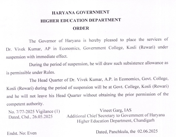 बीते दिनों इंदिरा गांधी विश्वविद्यालय से संबद्ध कॉलेजों में चल रहीं परीक्षाओं में अनियमितता पाए जाने पर कोसली राजकीय महाविद्यालय के कार्यकारी प्राचार्य विवेक कुमार को सस्पेंड किया गया था। इंदिरा गांधी विश्वविद्यालय की तत्कालीन कार्यवाहक प्राचार्या की सिफारिश पर उच्चतर शिक्षा निदेशालय ने यह कार्रवाई की थी। मामले में तत्कालीन कार्यवाहक कुलपति प्रो. दीप्ति धर्माणी ने कॉलेजों में परीक्षा व्यवस्था की जांच के लिए फ्लाइंग स्क्वाड के अतिरिक्त तीन अलग-अलग कमेटी का गठन किया था। इसमें कुलसचिव, परीक्षा नियंत्रक के साथ अन्य फ्लाइंग टीम के सदस्य शामिल थे, जिसकी रिपोर्ट कुलपति को भेजी गई थी। इसकी रिपोर्ट आईजीयू के माध्यम से उच्चतर शिक्षा निदेशालय को भी भेजी गई थी। इस पर संबंधित संस्था के मुखिया होने के नाते प्राचार्यों पर कार्रवाई की गई थी।